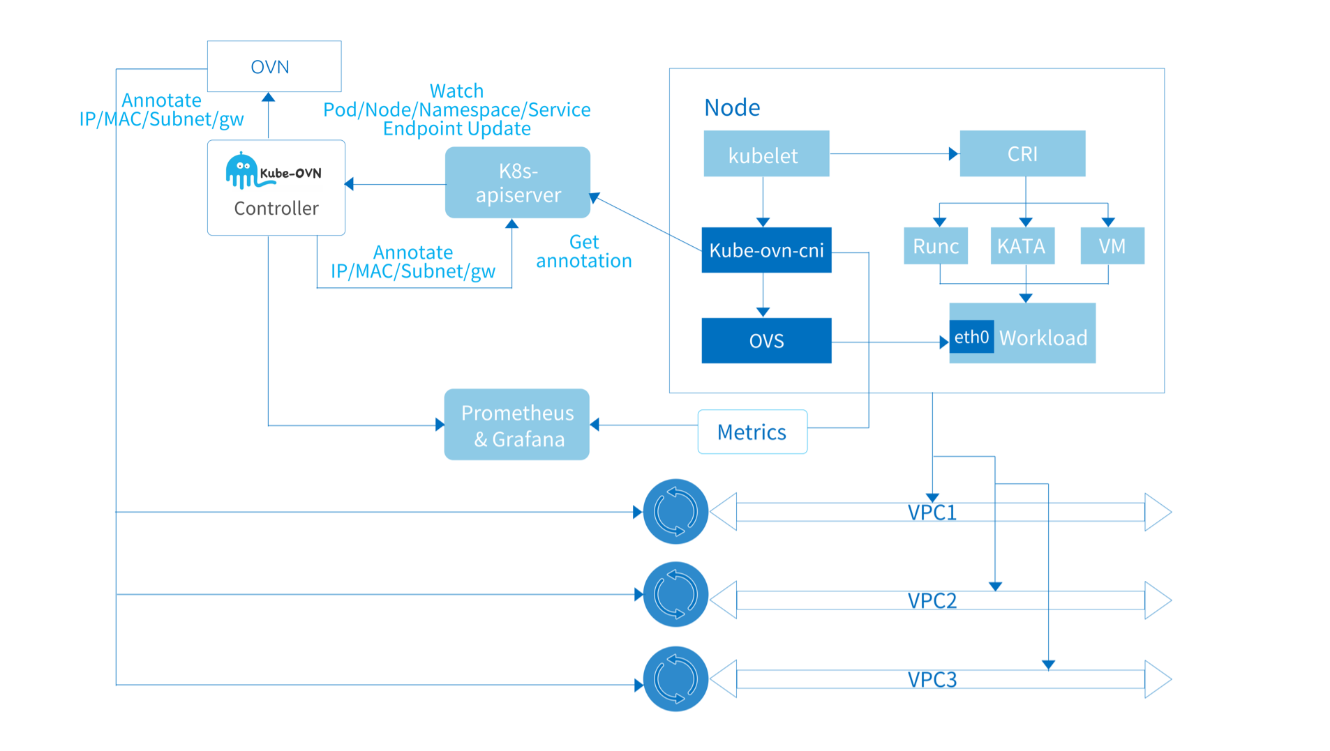 Upstream OVN/OVS Componentsovn-centralovs-ovnCore Controller and Agentkube-ovn-controllerkube-ovn-cniMonitoring, Operation and Maintenance Tools and Extension Componentskube-ovn-speakerkube-ovn-pingerkube-ovn-monitorkubectl-koUpstream OVN/OVS Components